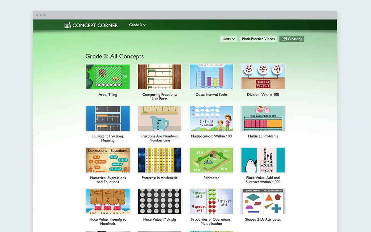 Concept Corner is a media-rich Mathematics tool and interactive concept navigator for K-11 students, and teachers. The site allows for self-directed practice, assessment, and exploration for students. It is designed to address the most commonly identified challenges for students learning Common Core Mathematics concepts.